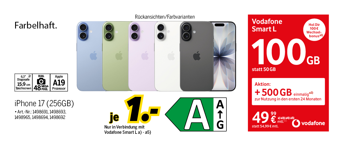 a1) Erhalte 100 € Wechselbonus, wenn Deine Aktivierung im Aktionszeitraum erfolgt. Deine Rufnummernportierung aus dem Vertrag muss innerhalb von 180 Tagen nach Tarifaktivierung erfolgen. Gilt nur, wenn für Deine zu portierende Rufnummer in den letzten 6 Monaten kein Vodafone Vertragsverhältnis bestand. Gilt nicht für Rufnummernportierungen aus anderen Tarifen/Verträgen der Vodafone GmbH. Die Gutschrift erfolgt frühstens 28 Tage nach Bestätigung des Portierungsdatums. Keine Barauszahlung möglich.